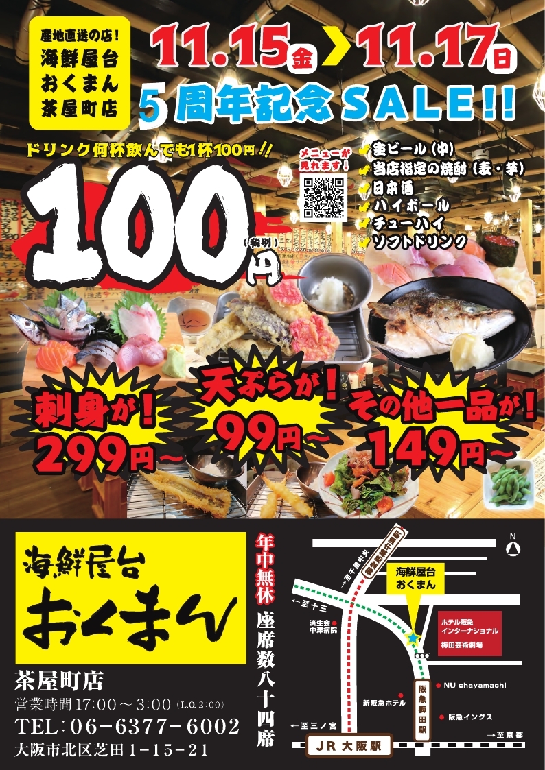 海鮮屋台おくまん茶屋町店5周年記念セール!!11月15日(金)~17日(日)