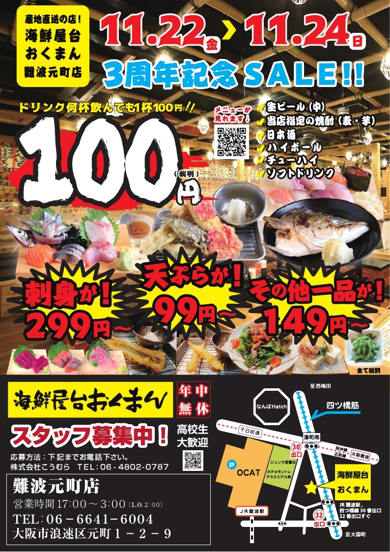 海鮮屋台おくまん難波元町店  3周年記念セール!